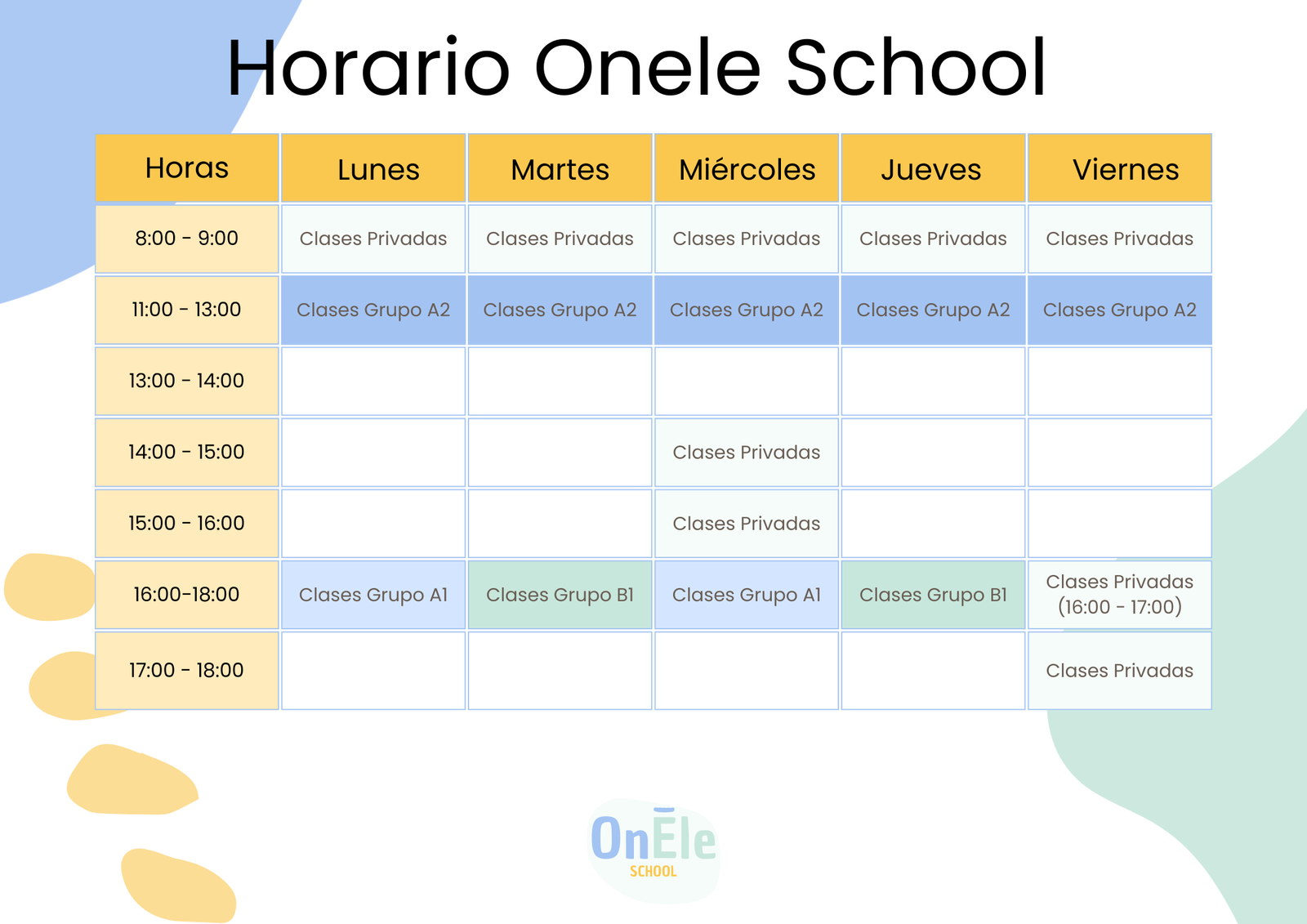 Una vez realices tu test de nivel y tengas los resultados, las clases en grupos tienen un horarios segun su nivel ¡Tenlo en cuenta a la hora de reservar los horarios! las horas son las siguientes: